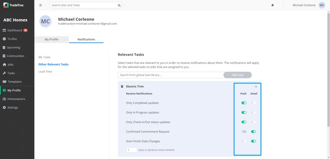 ***Toggle the Push or Email switch for each notification to Enable the notification for each task you are assigned to.
