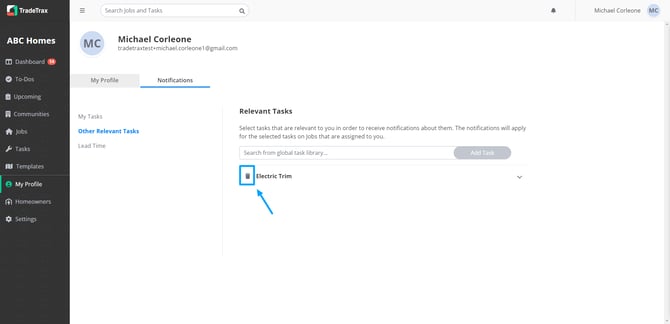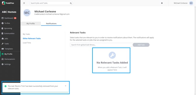 You can search, add or delete Relevant Tasks that you wish to monitor closely. This may include a new Trade on the job site, Tasks for Homeowner updates, and other tasks for your role you wish to have more insight on.