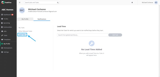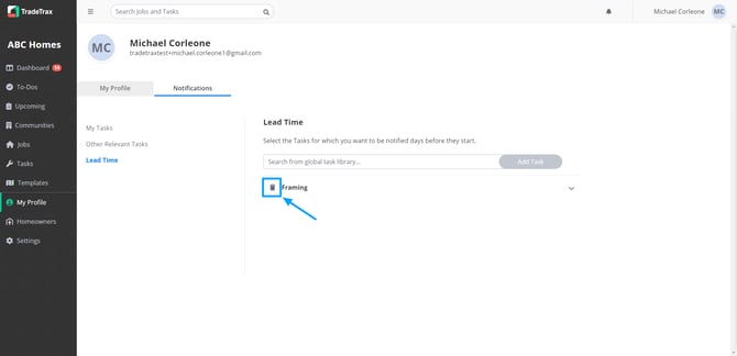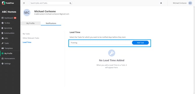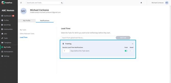 You can search, add or delete Tasks that you wish to be notified about before they start. The default setting when adding a Lead Time Notification will be a 7-day window. This can be helpful for you if you are purchasing materials or scheduling upcoming tasks.